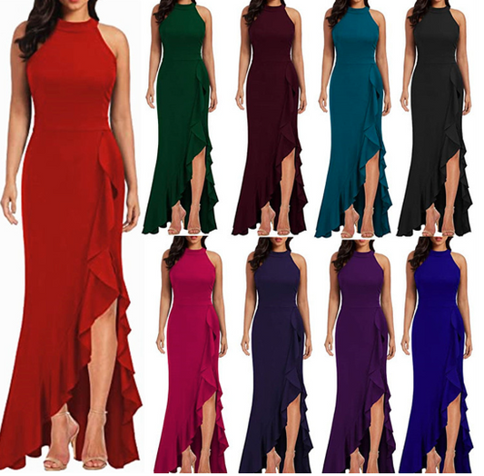 Womens High Neck Split Solid Color Sleeveless Bodycon Mermaid Evening Cocktail Long